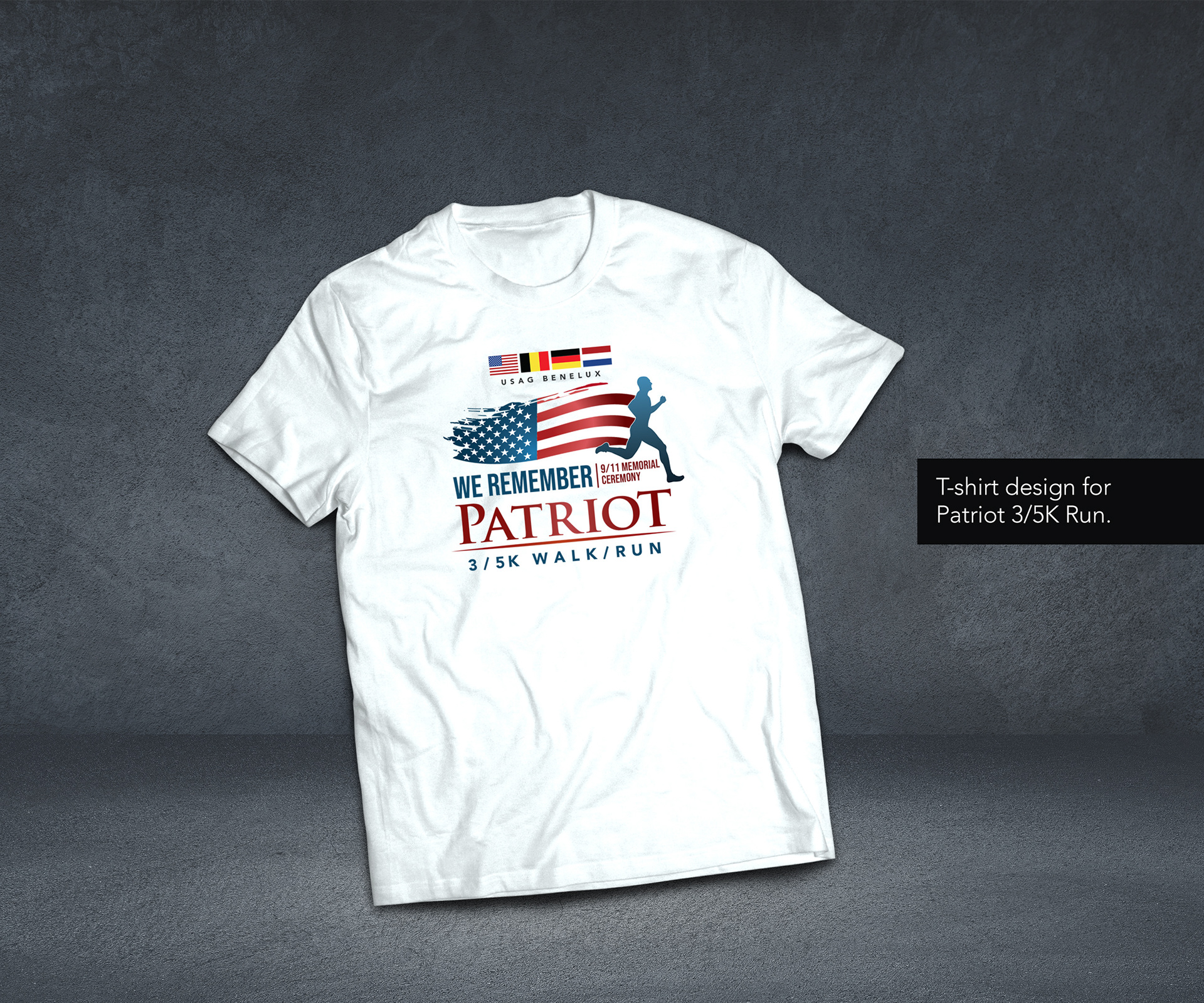 Task: Create a visual identity and social media campaign for a 9/11 Remembrance event, to be followed by a 5K Patriot Run. Multiple print and digital deliverables required. Main visual should be patriotic yet somber, and reflect the significant loss of life.